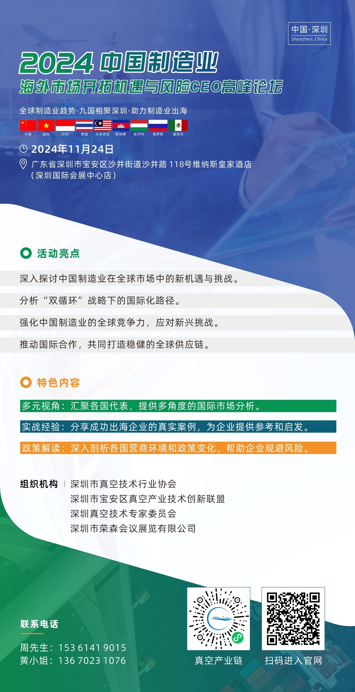 12:30-13:30 论坛签到 13:30-13:40 参会嘉宾入场 13:40-13:45 主持人入场 13:45-13:50 论坛开幕 13:50-14:00 主持人介绍大会及特邀嘉宾 14:00-14:05 主办方致欢迎词 14:05-14:10 特邀嘉宾致辞 14:10-14:15 特邀嘉宾致辞 14:15-14:20 特邀嘉宾致辞 14:20-14:30 政府部门致辞 14:30-14:20 政府部门政策代表推介 14:20-14:40 政府部门商务代表推介 14:40-15:00 主旨报告(全球贸易环境及国内出海现状)拟定 15:00-15:25 拟邀请越南代表分享 15:25-15:50 拟邀请印尼代表分享 15:50-16:15 拟邀请泰国代表分享 16:15-16:40 拟邀请马来西亚代表分享 16:40-17:05 拟邀请匈牙利代表分享 17:05-17:30 拟邀请俄罗斯代表分享 17:30-17:55 拟邀请企业出海代表经验分享1 17:55-18:20 拟邀请企业出海代表经验分享2 18:20-18:45 参与真空协会组织的海外版工业游学活企业代表分享 18:45-19:00 论坛总结与闭幕 |